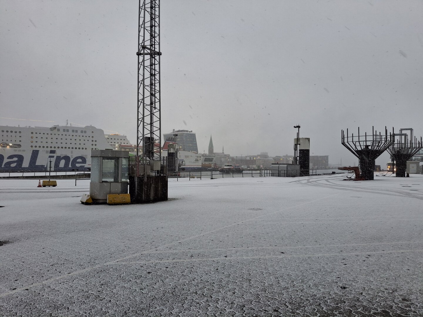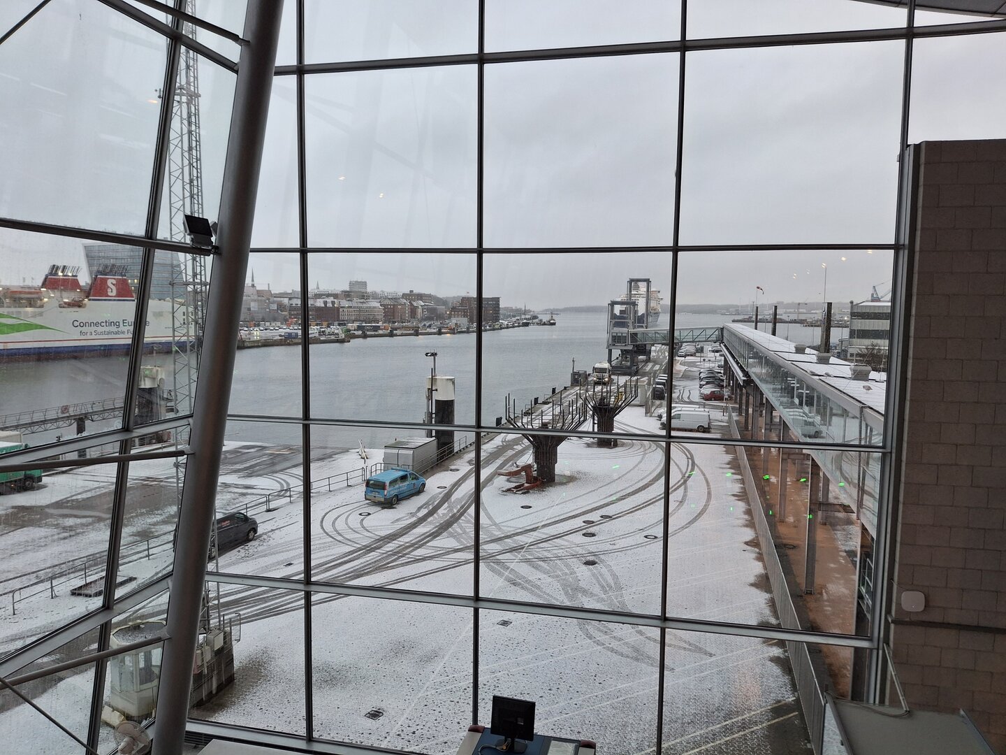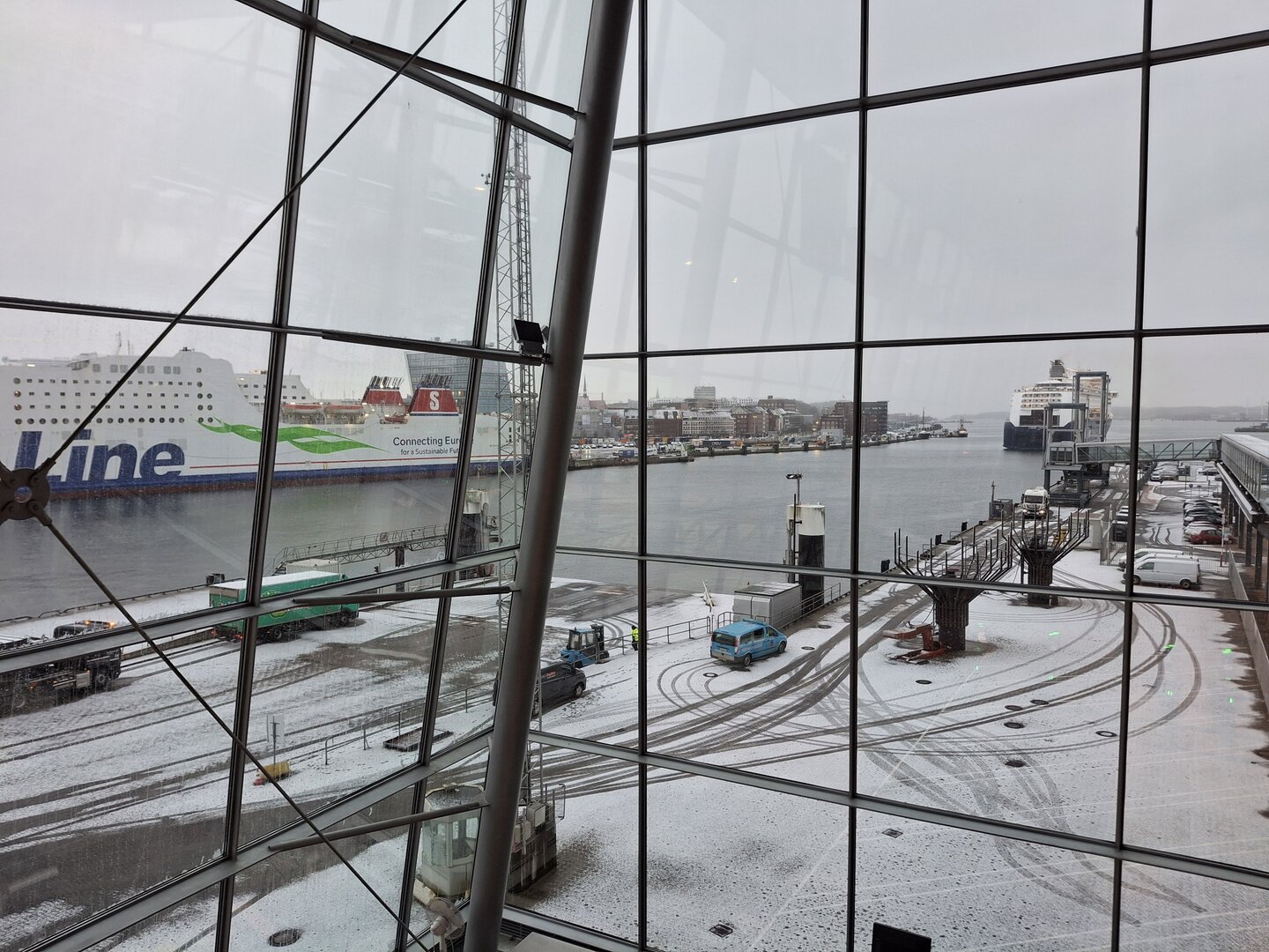 Entsprechend zeitig und pünktlich startete ich mit einem "Fremdbus" der Firma Thiemann nach Kiel. Bis zu meiner Frühstückspause auf der Raststätte Aarbachkate lief es flüssig. Ab Hamburg setzte dann Schneetreiben ein. Entsprechend langsam ging es bis Kiel weiter, wo ich trotzdem rechtzeitig und noch vorm Eintreffen der Fähre aus Olso, eintraf. Ich hatte noch ein wenig Zeit und erkundete die Abfertigungshalle und genoss den winterlichen Ausblick in Richtung Kieler City. Auf dem Fußweg zurück zum Bus erfragte ich dann die Details, wo ich die beiden Gepäckcontainer meiner beiden Reisegruppen in Empfang nehmen würde.