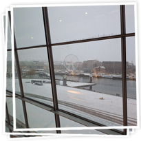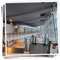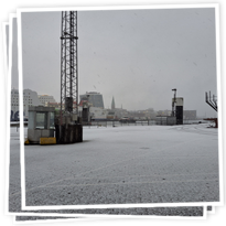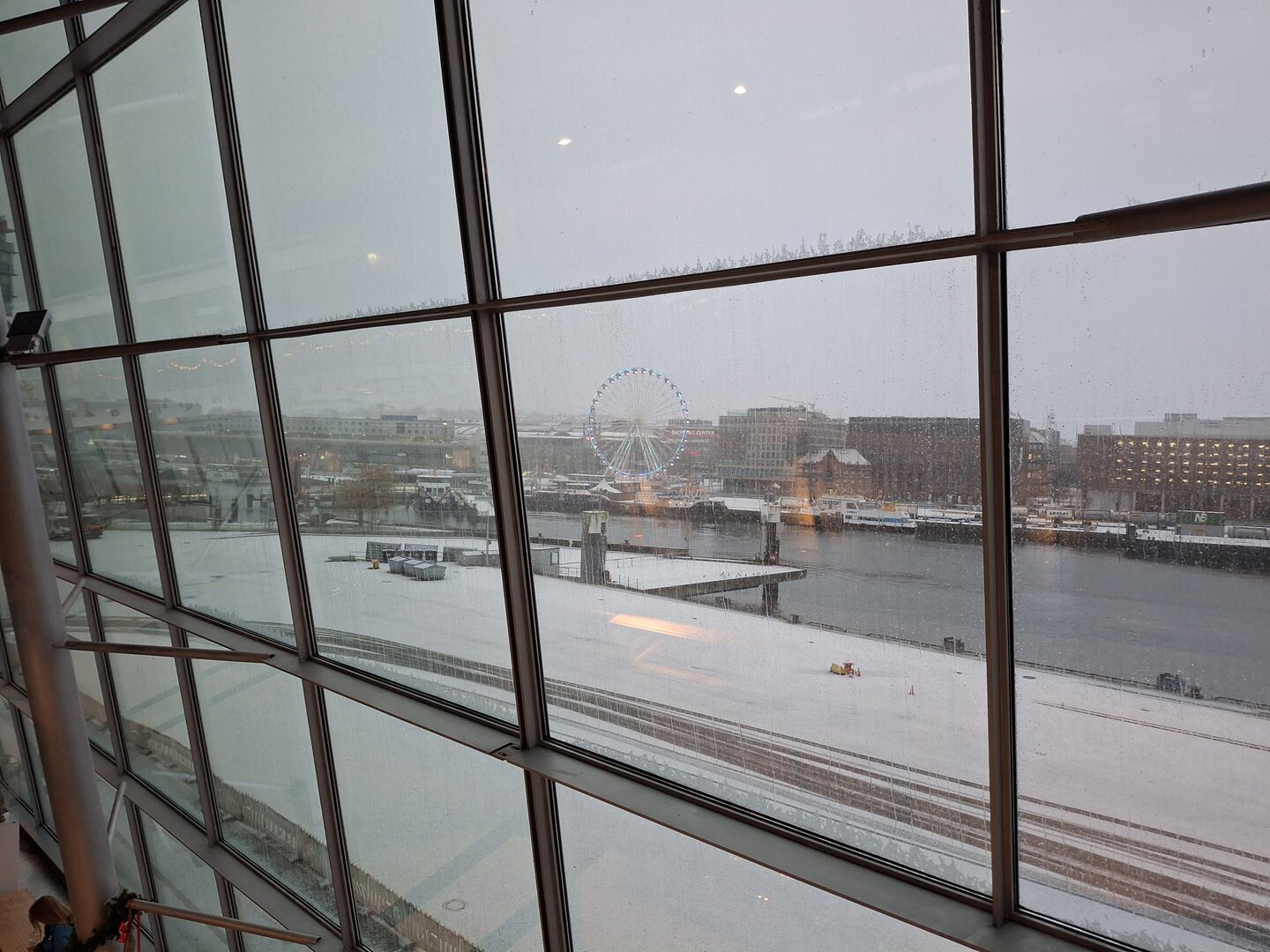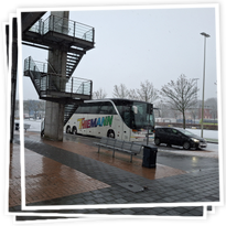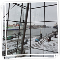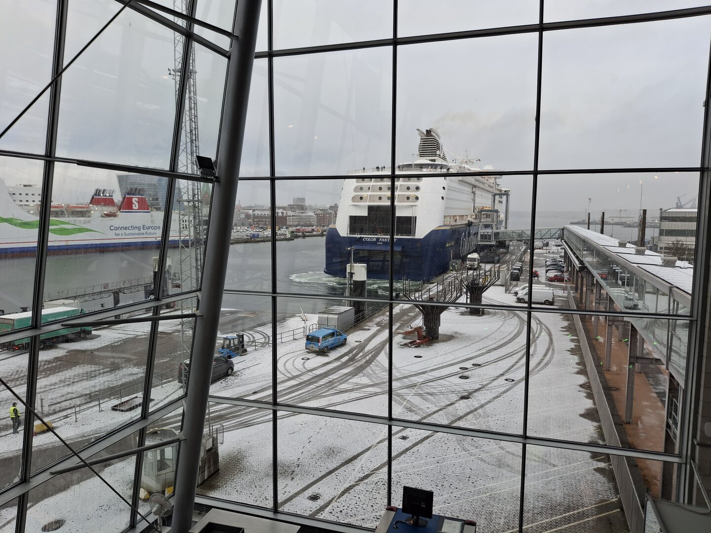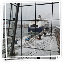 Entsprechend zeitig und pünktlich startete ich mit einem "Fremdbus" der Firma Thiemann nach Kiel. Bis zu meiner Frühstückspause auf der Raststätte Aarbachkate lief es flüssig. Ab Hamburg setzte dann Schneetreiben ein. Entsprechend langsam ging es bis Kiel weiter, wo ich trotzdem rechtzeitig und noch vorm Eintreffen der Fähre aus Olso, eintraf. Ich hatte noch ein wenig Zeit und erkundete die Abfertigungshalle und genoss den winterlichen Ausblick in Richtung Kieler City. Auf dem Fußweg zurück zum Bus erfragte ich dann die Details, wo ich die beiden Gepäckcontainer meiner beiden Reisegruppen in Empfang nehmen würde.