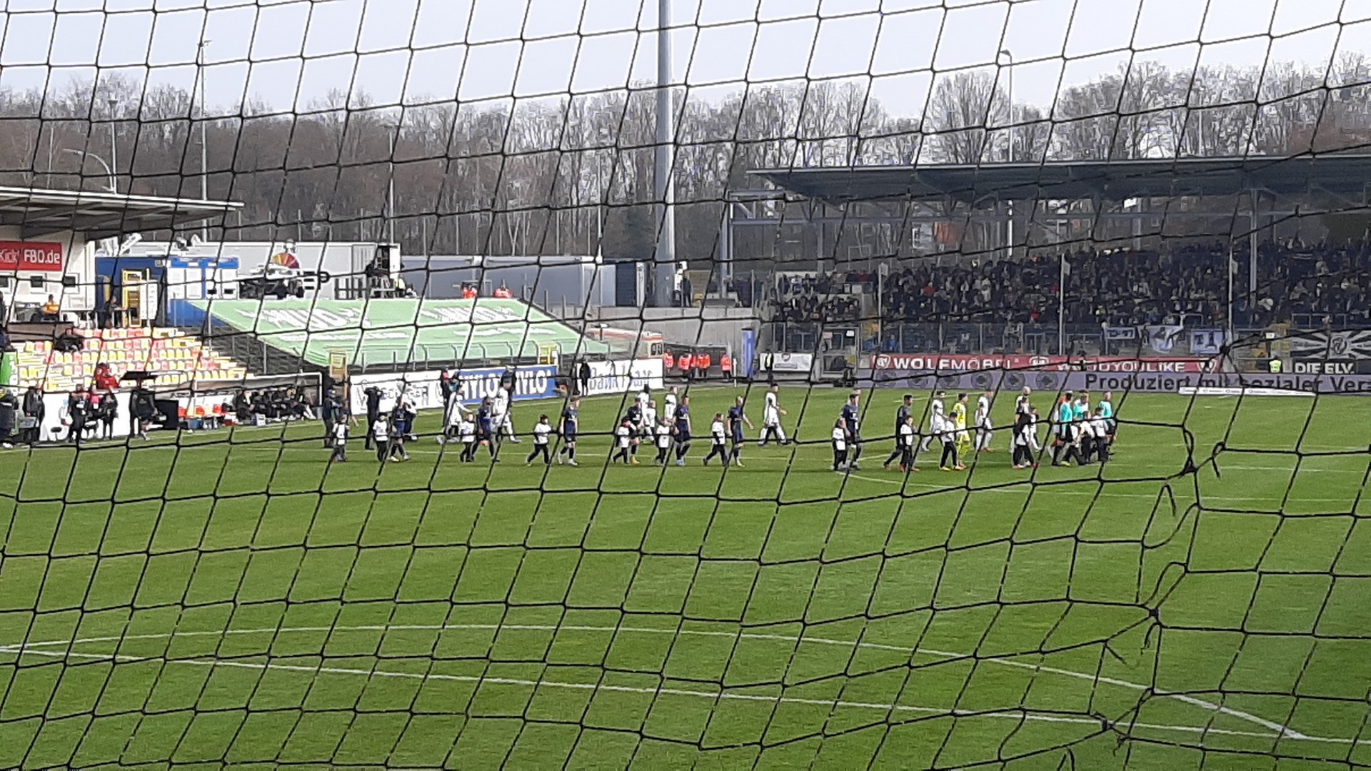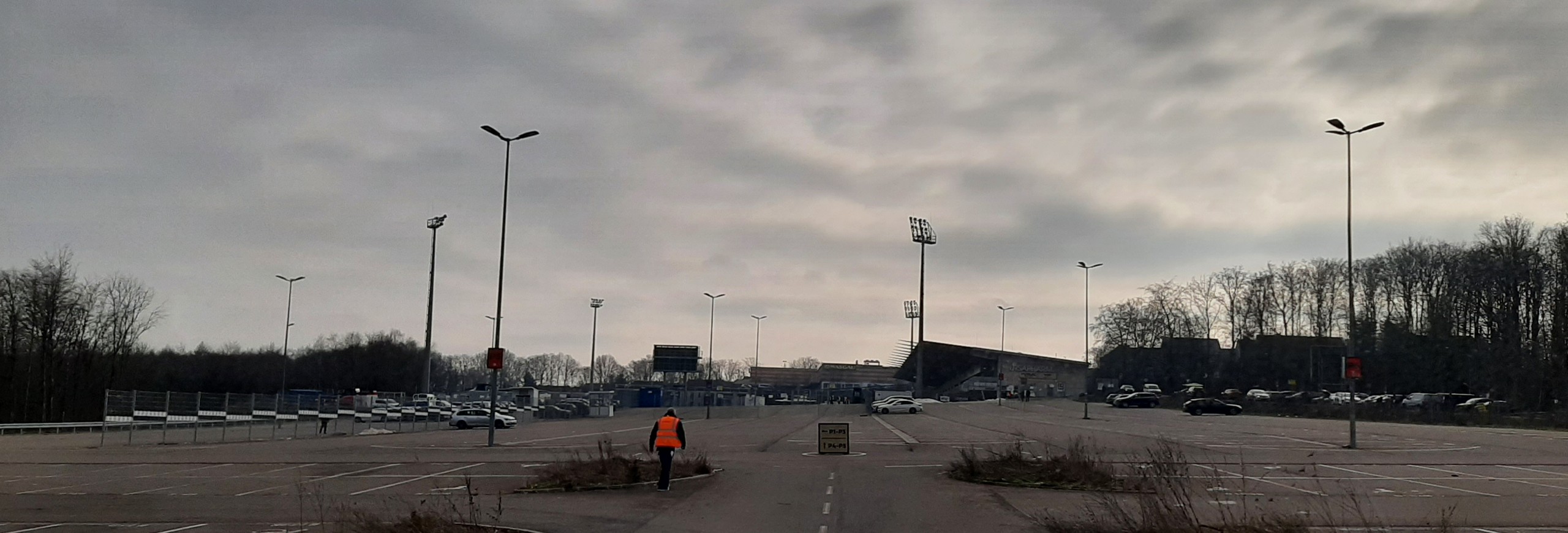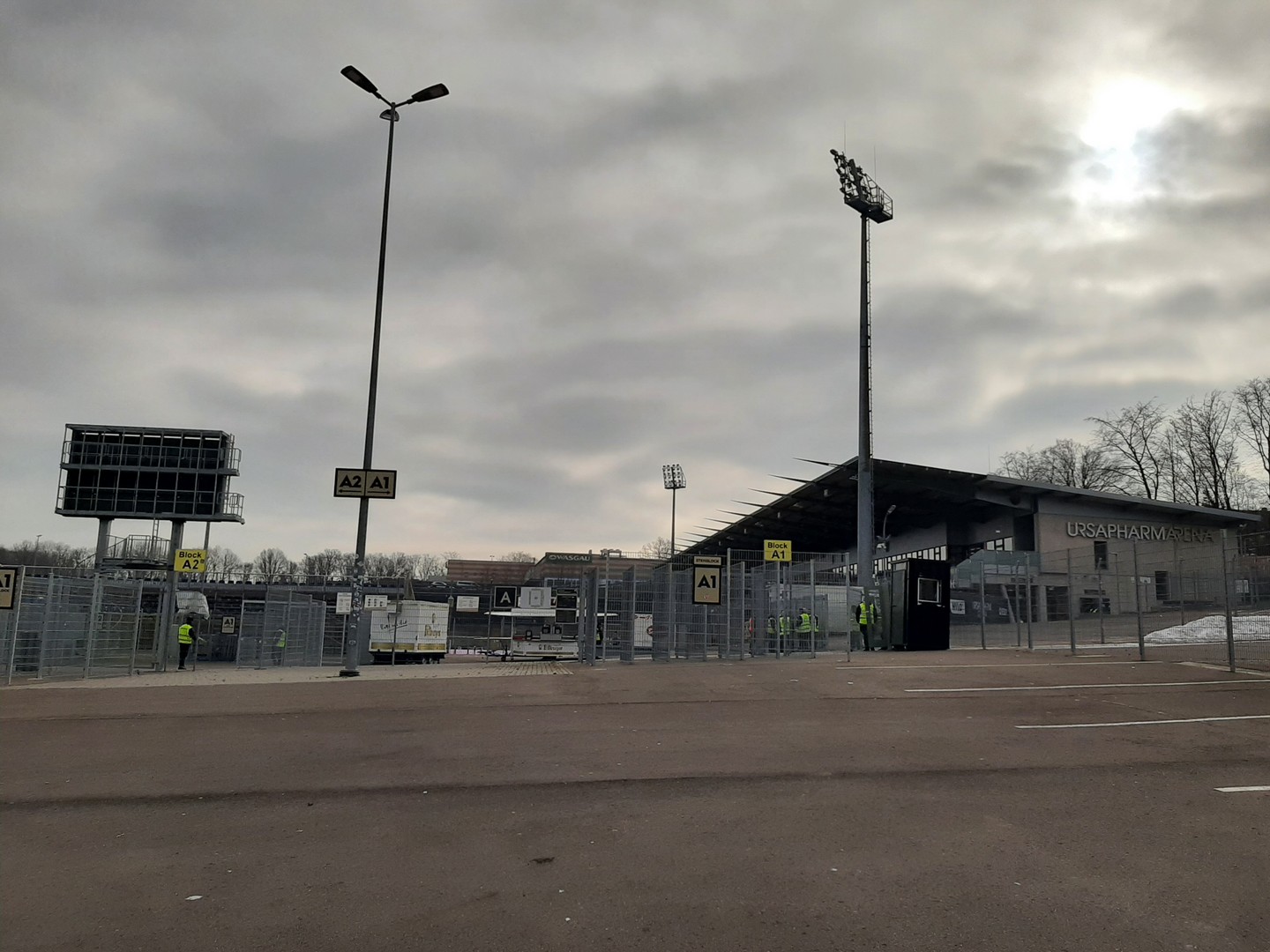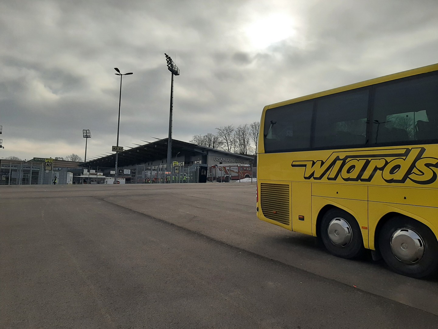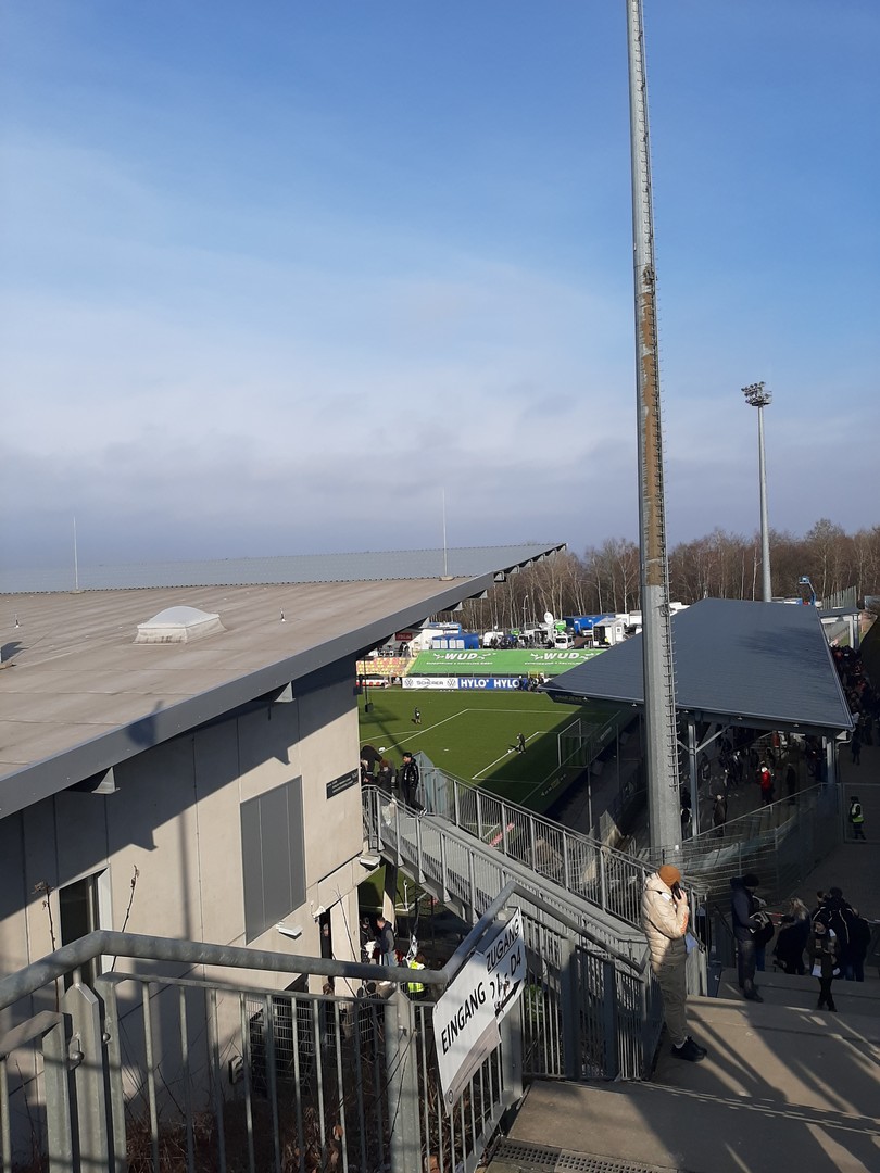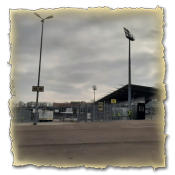 sind wir um 11.45 Uhr an der Ursapharm-Arena nahe Saarbrücken angekommen. Da nis zum Anpfiff um 14 Uhr noch Zeit war, nutzte ich diese mit meinem Kollegen Klaus für eine kleine Stärkung im naheliegendem Einkaufsmarkt. Inzwischen konnte sich die Sonne auch durch den Nebel kämpfen und mit schon 6 Grad war es recht angenehm. Da bis zum Anpfiff noch Zeit war, spazierten wir noch einmal um die Arena.