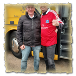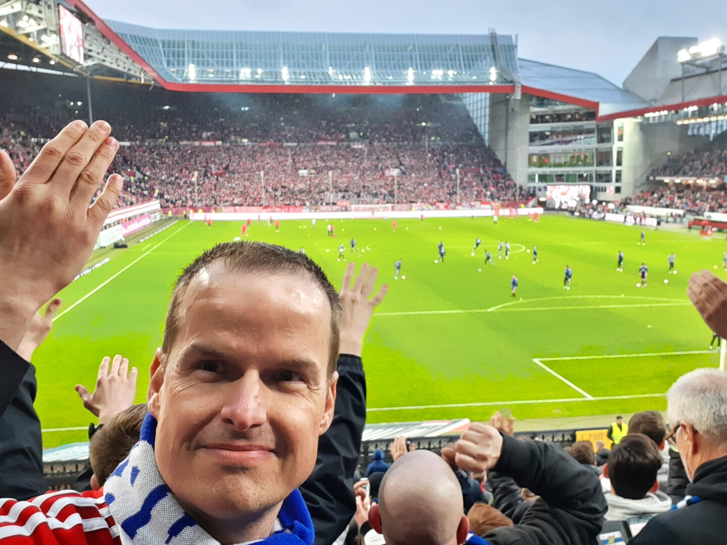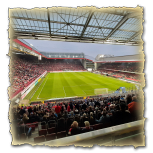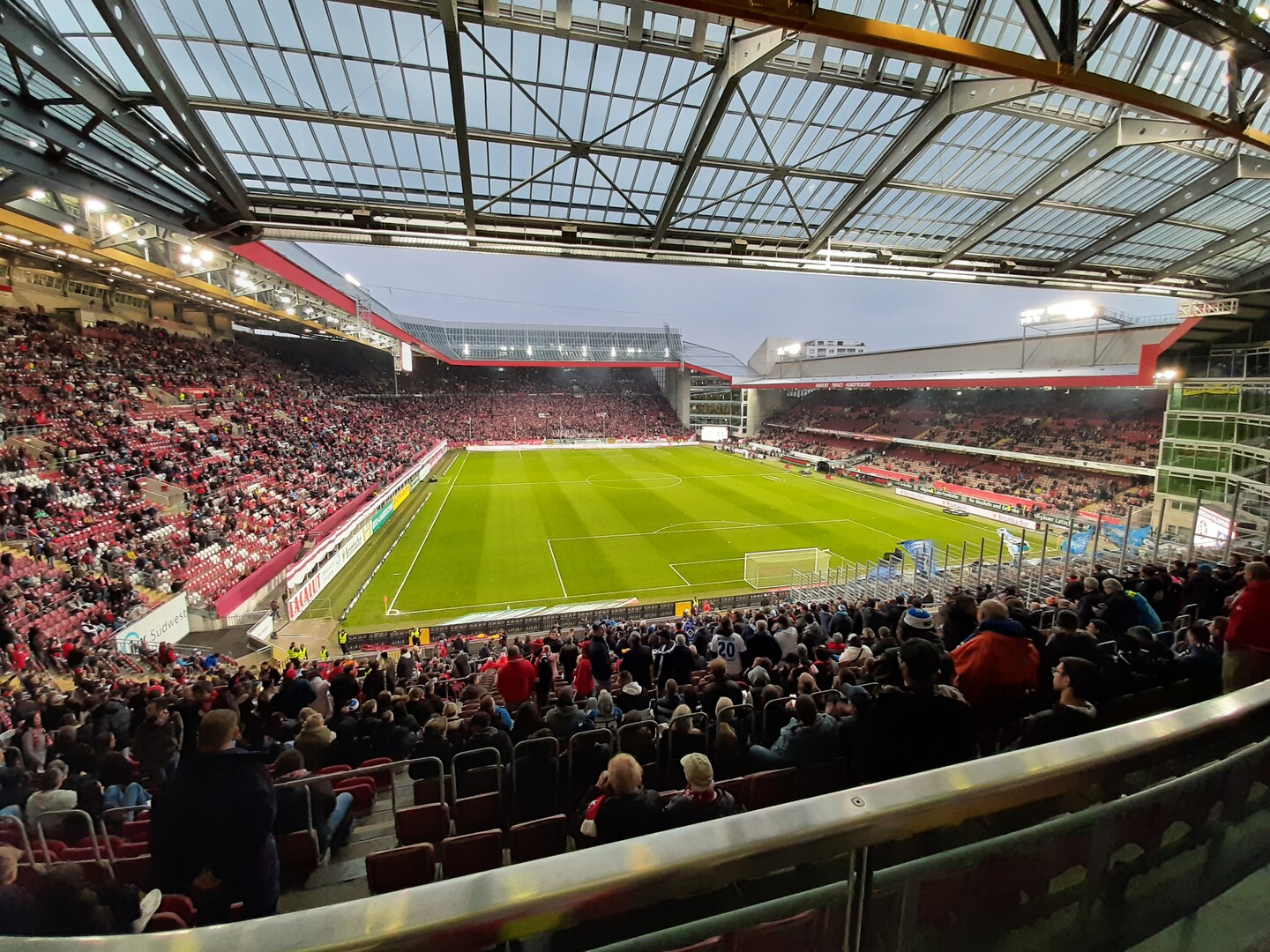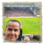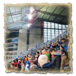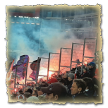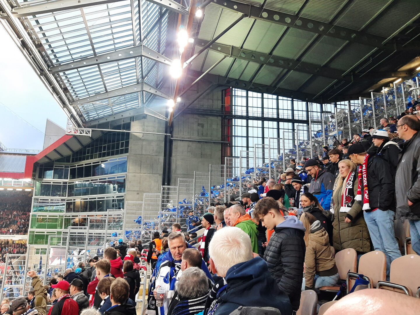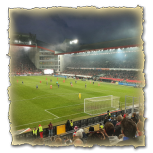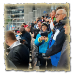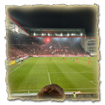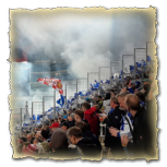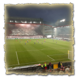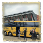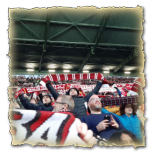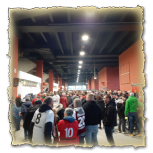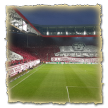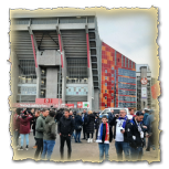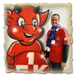 Oben angekommen standen bereits zahlreiche andere HSV-Fanbusse u.a. aus Beligien, Luxemburg und Deutschland. Von dort aus fiel man quasi ins Stadion, denn die Busse parkten an der Gästeblock-Tribühne. Noch 90 Minuten bis zum Anpfiff. Bevor es los ging bedankte sich der Fanclub beim Busfahrer-Team mit einem Präsent und einem "Trinkgeld", worüber wir uns beide sehr gefreut haben. Nach einem gemeinsamen Erinnerungsfoto brachen wir dann auf ins Stadion. Herwig "passte" dann auf den Bus auf und ich streifte mir mein Trikot und Schal über und machte mich auf den kleinen Fußmarsch zum Eingang. Noch 60 Minuten bis zum Anpfiff. Ich war inzwischen, in einem der Austragungsorte (der damaligen Fußball-Heim-WM 2006), drin und durfte zum ersten Mal die Arena kennenlernen. In Ruhe schaute ich mir die Spielstätte an und fand auch schnell das Maskotchen, den Roten Teufel. Noch 35 Minuten bis zum Spiel. Ich war inzwischen auf dem Oberrang der Nordkurve angekommen und ließ die ersten