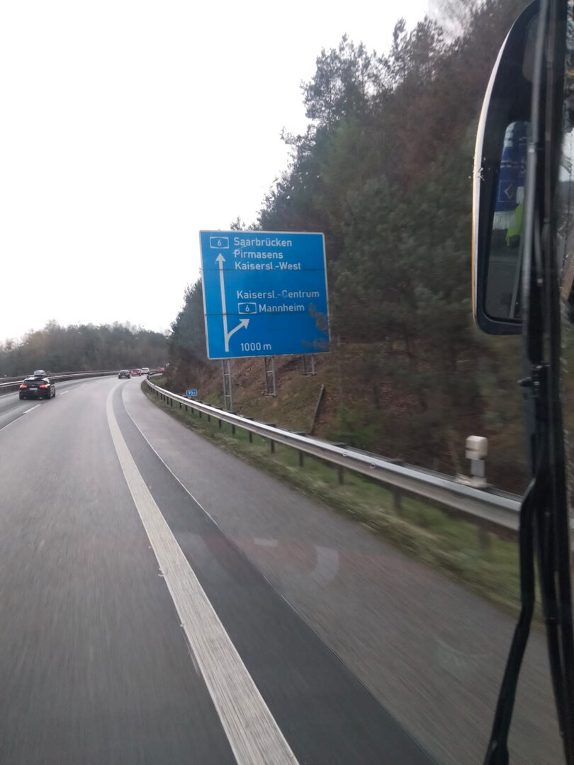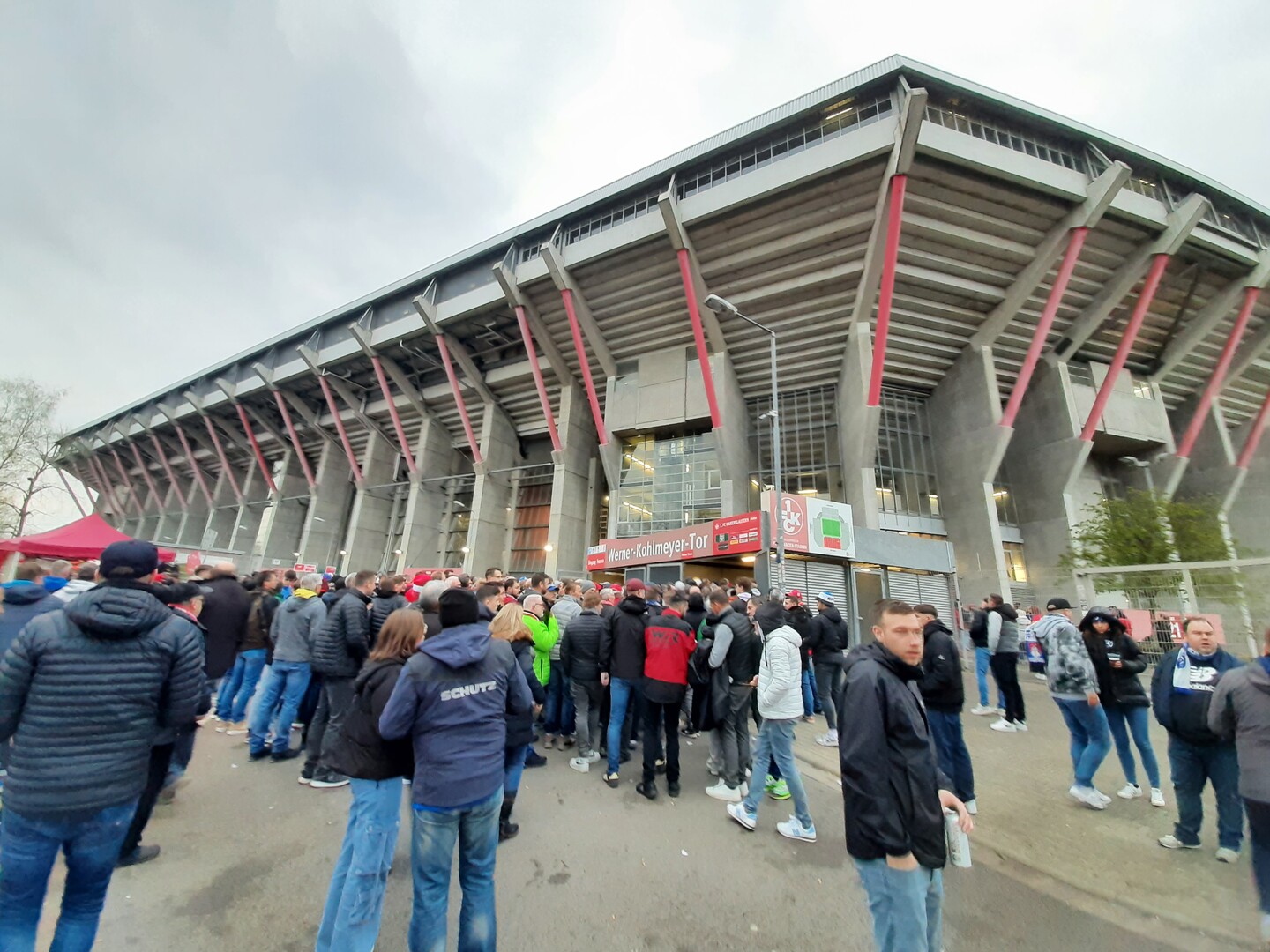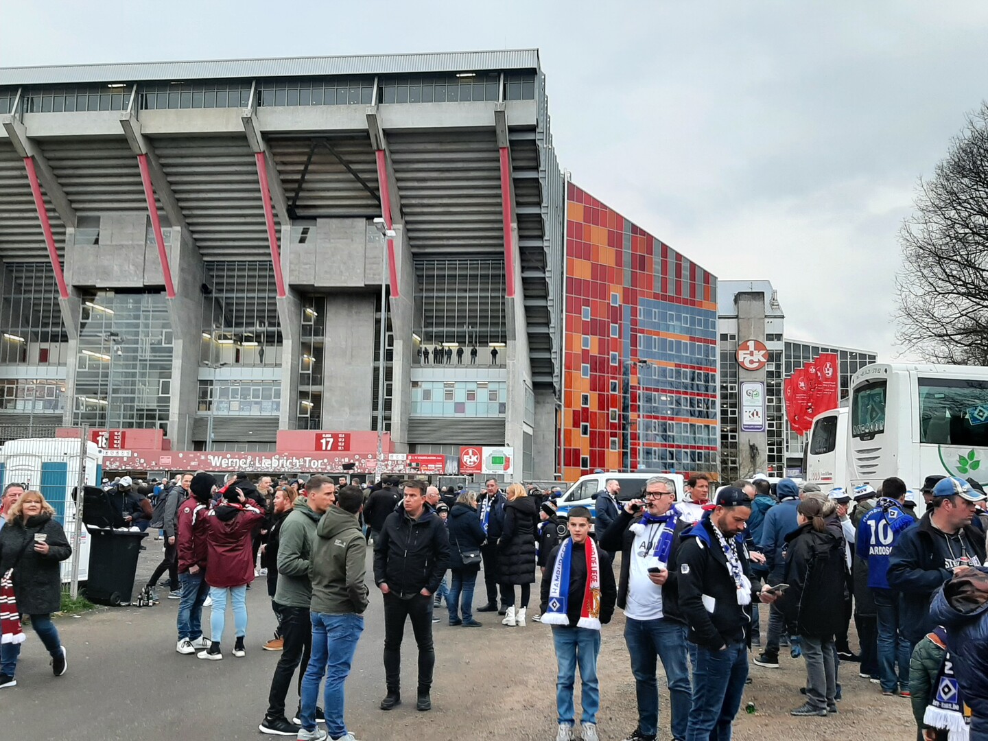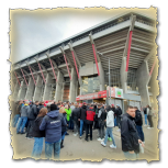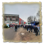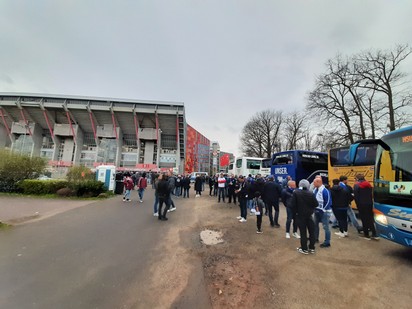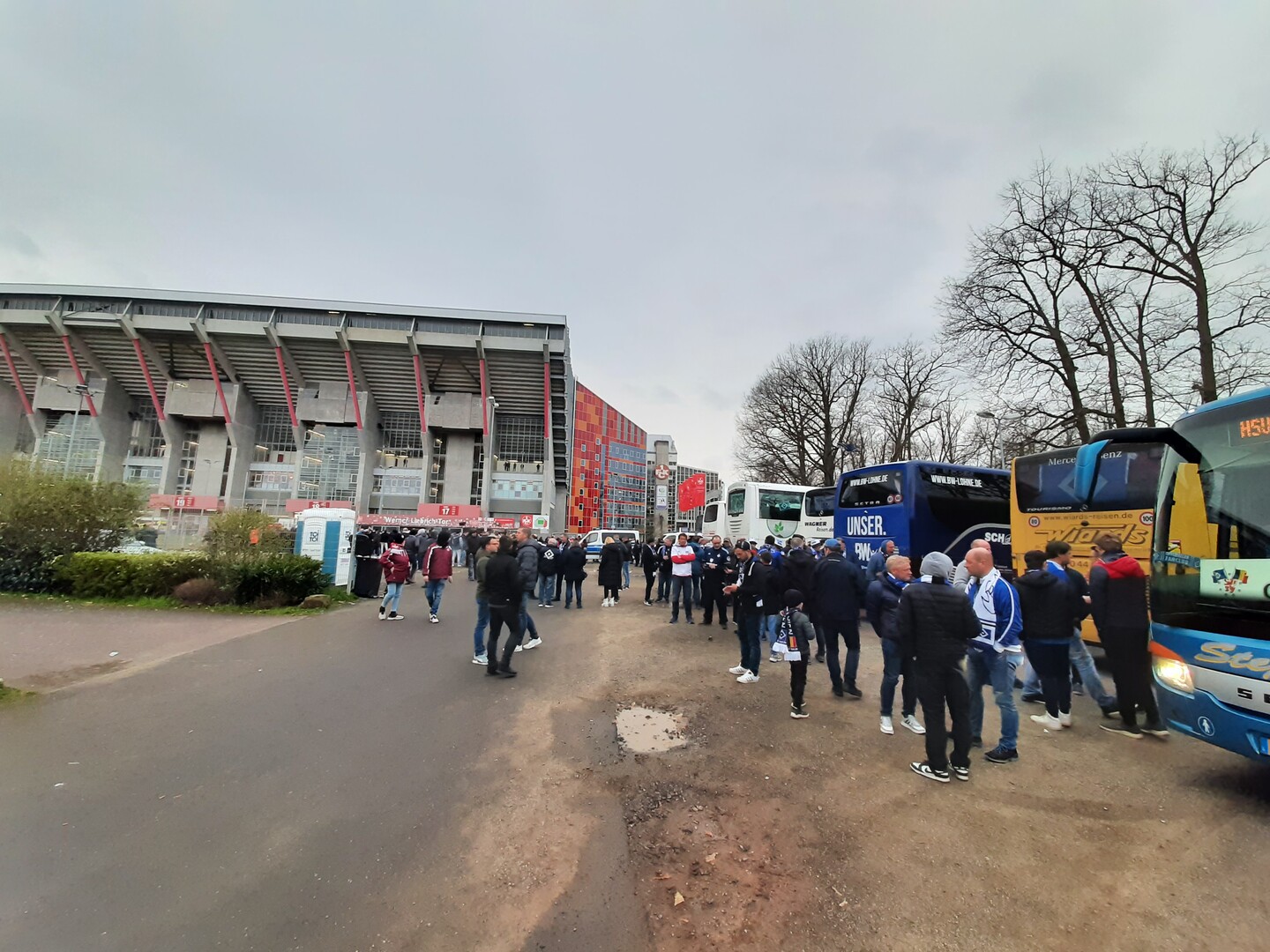 Um kurz nach 10 Uhr stieg ich als 2.Busfahrer in Großenmeer dazu. Mein Kollege Herwig sammelte bis dahin schon die 24 Fans aus der Wesermarsch ein. Und so ging es bei nasskaltem und regnerischem Wetter auf die knapp 600 Kilometer. Dort wurde um 20.30 Uhr das Top-Spiel der 2. Liga unter Flutlicht zwischen den Roten Teufeln und dem Bundesliga Dino angepfiffen. Unsere Fahrt war bis 30 Kilometer vor dem Ziel sehr entspannt. Nur leider war das letzte Stück der Autobahn bis zu unserer planmäßigen Abfahrt gesperrt und wir mussten eine Umleitung in Kauf nehmen. Aber wir hatten genügend Zeitpuffer. Um 17.30 Uhr sind wir dann in Kaiserslautern von der Polizei abgefangen worden und mit Blaulicht bis vor das Stadion gebracht worden. Bereits während der Anfahrt zum Stadion sah man das Fritz-Walter-Stadion auf dem "Betzenberg" und die vielen tausend Fans, die ebenfalls zum Spiel wollten.