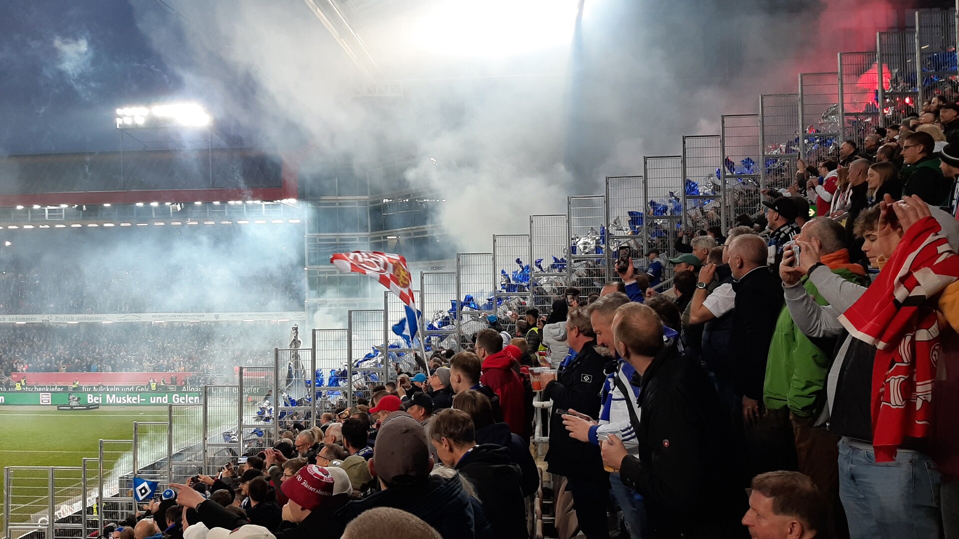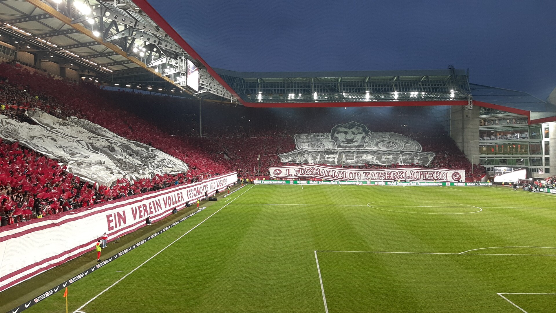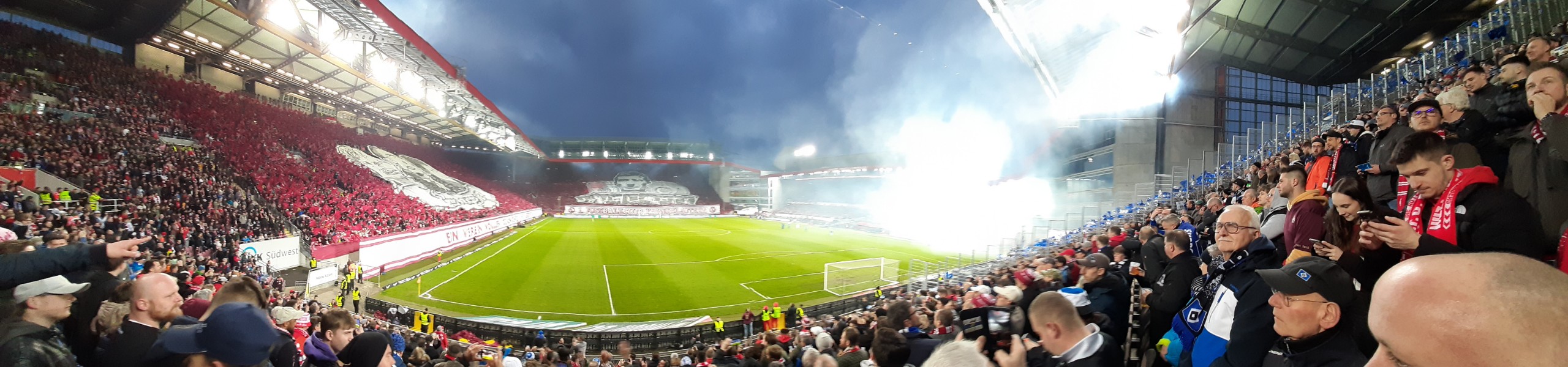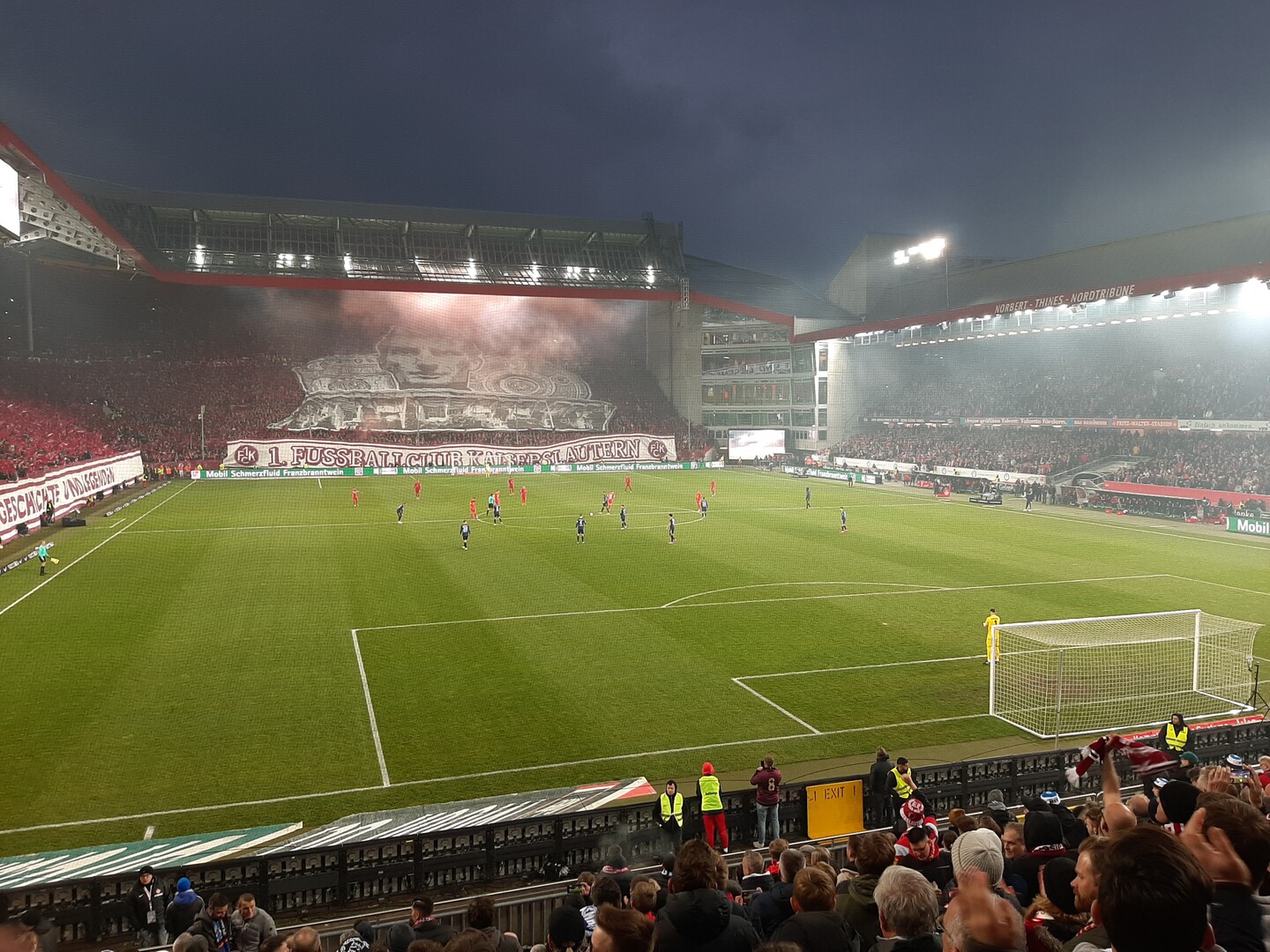 Eindruck auf mich einwirken und ahnte schon, es würde ein besonderer Abend werden. Kurze Zeit später kamen bereits beide Mannschaften zum einlaufen rein und es wurde auf beiden Seiten sehr laut. Noch 10 Minuten bis zum Spiel. Der Betzenberg war mit 49.326 Zuschauern ausverkauft und die Stimmung war absolut Erstligareif. Die Choreografie war einfach nur Gänsehaut pur! Unterstützt wurde diese seitens der HSV-Fans (leider) mit Bengalos und Knaller die in den Himmel geschossen wurden.