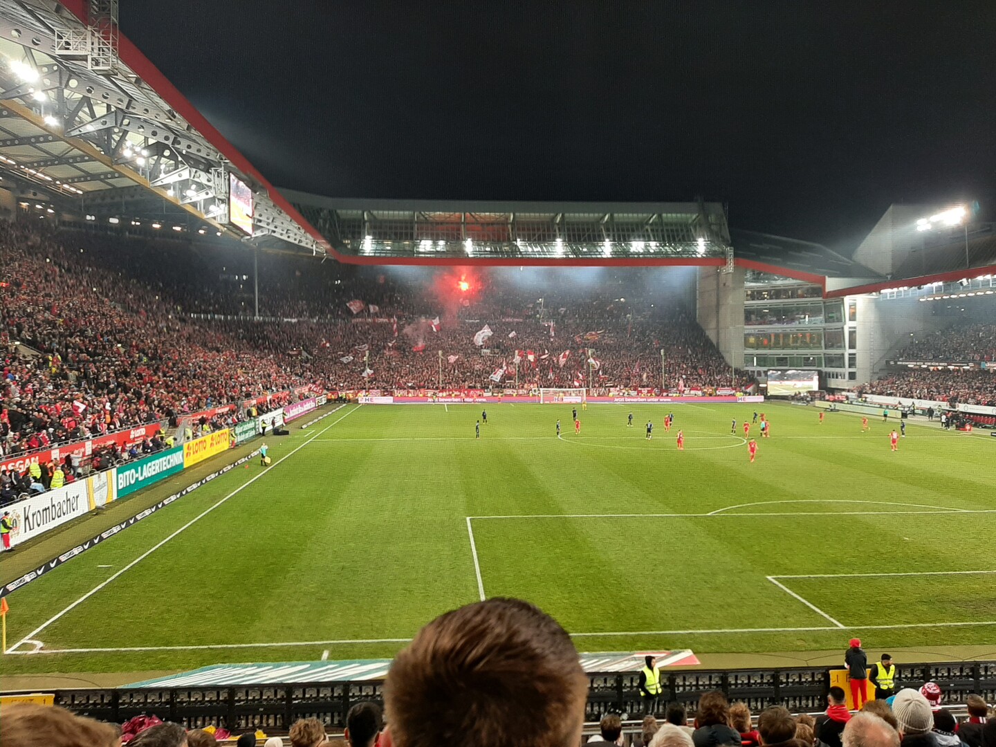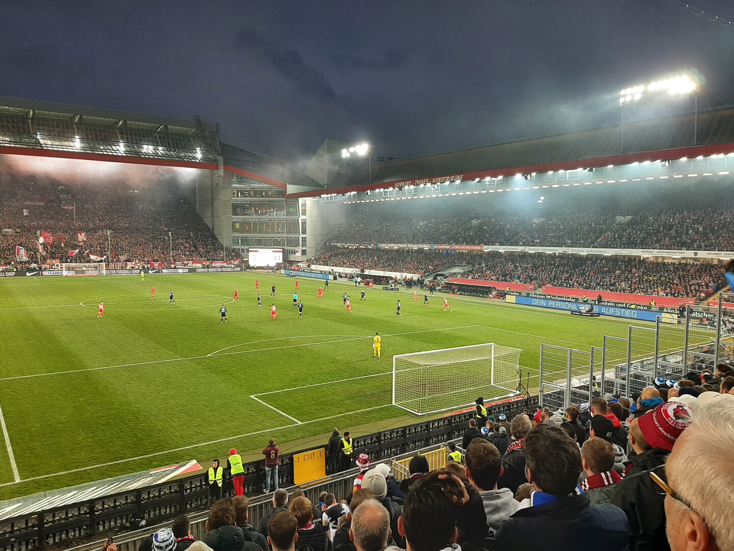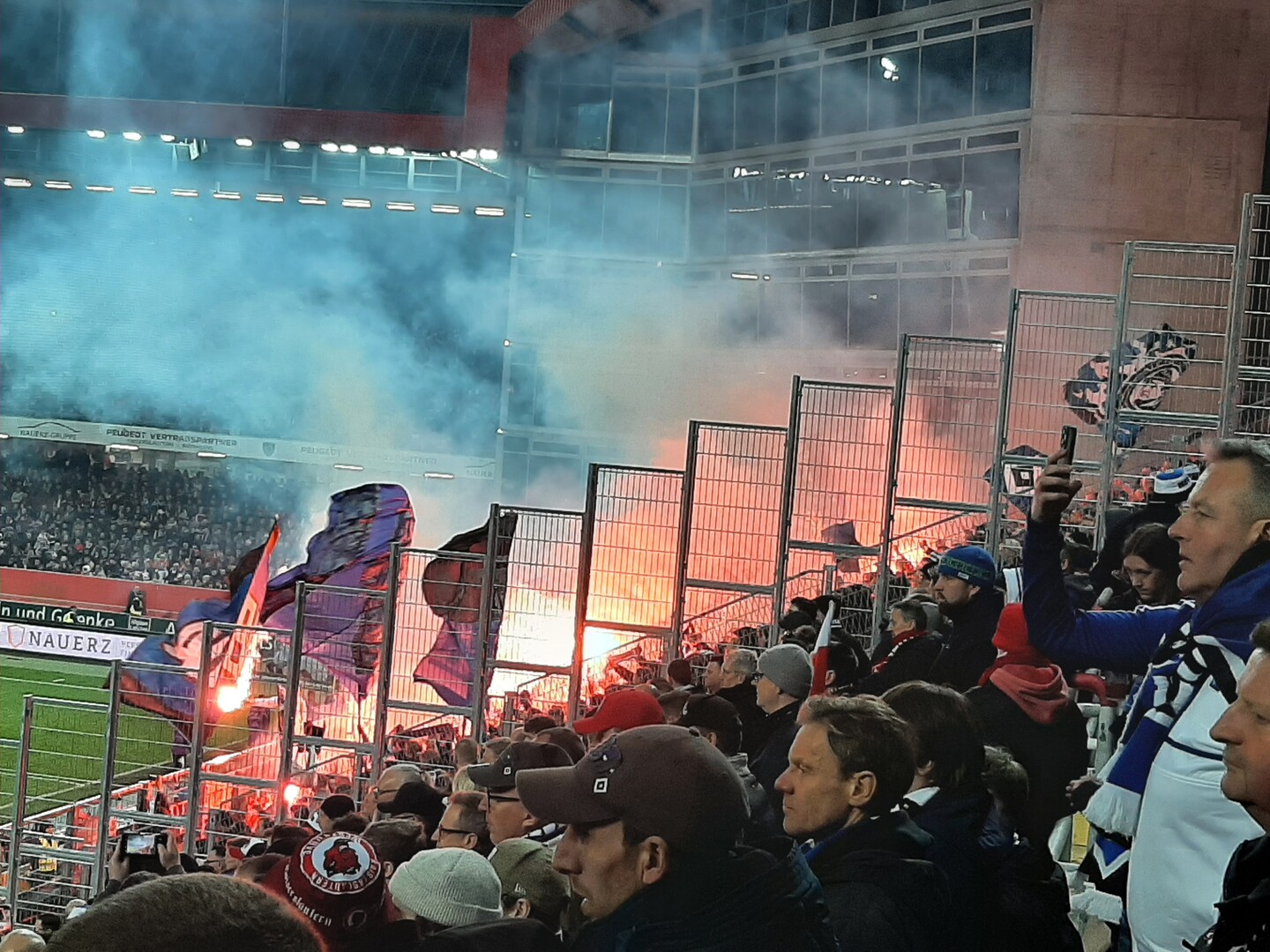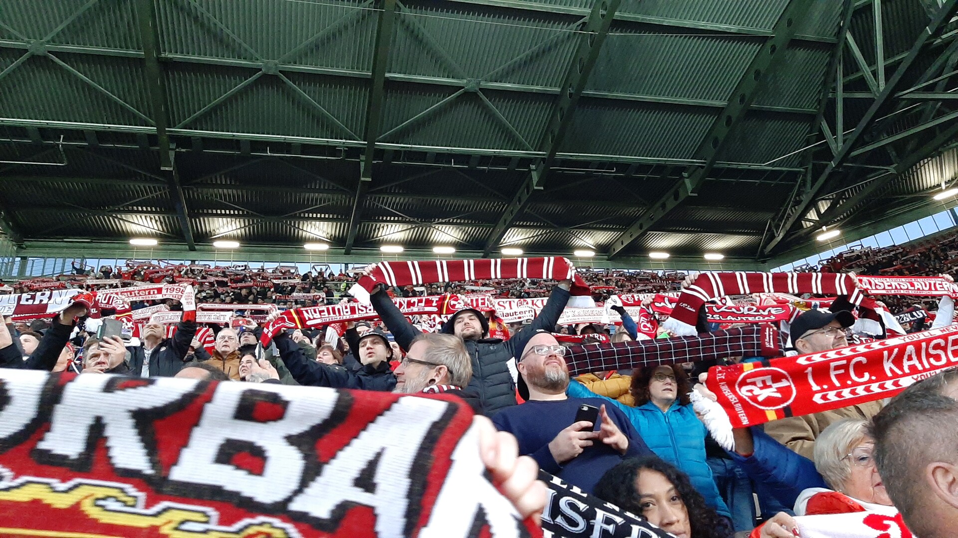 Eindruck auf mich einwirken und ahnte schon, es würde ein besonderer Abend werden. Kurze Zeit später kamen bereits beide Mannschaften zum einlaufen rein und es wurde auf beiden Seiten sehr laut. Noch 10 Minuten bis zum Spiel. Der Betzenberg war mit 49.326 Zuschauern ausverkauft und die Stimmung war absolut Erstligareif. Die Choreografie war einfach nur Gänsehaut pur! Unterstützt wurde diese seitens der HSV-Fans (leider) mit Bengalos und Knaller die in den Himmel geschossen wurden.